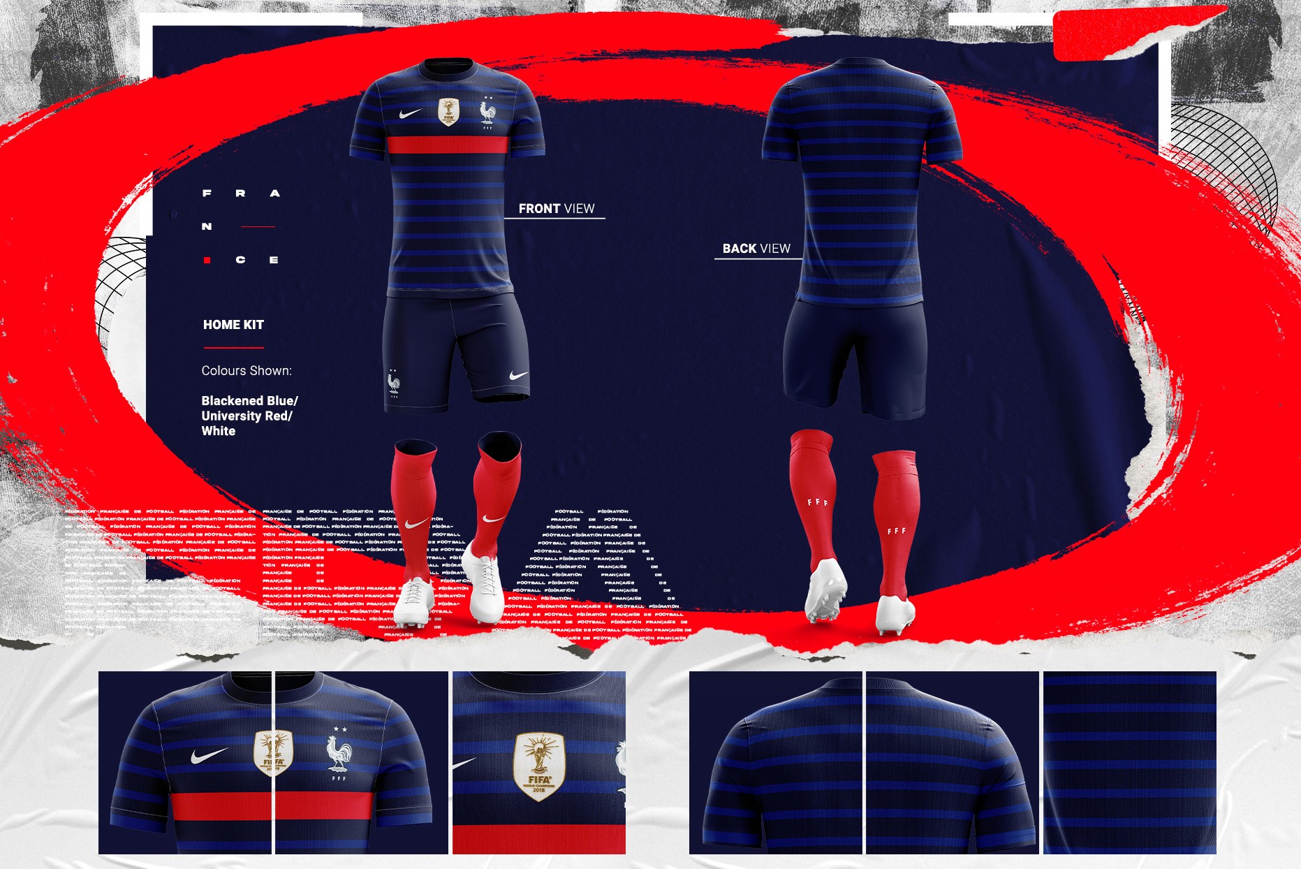 The design was structured into sections, each representing a different part of the squad – forwards, midfielders, and defenders. A consistent French colour scheme of blue, white, and red was used throughout to reinforce the team’s identity.