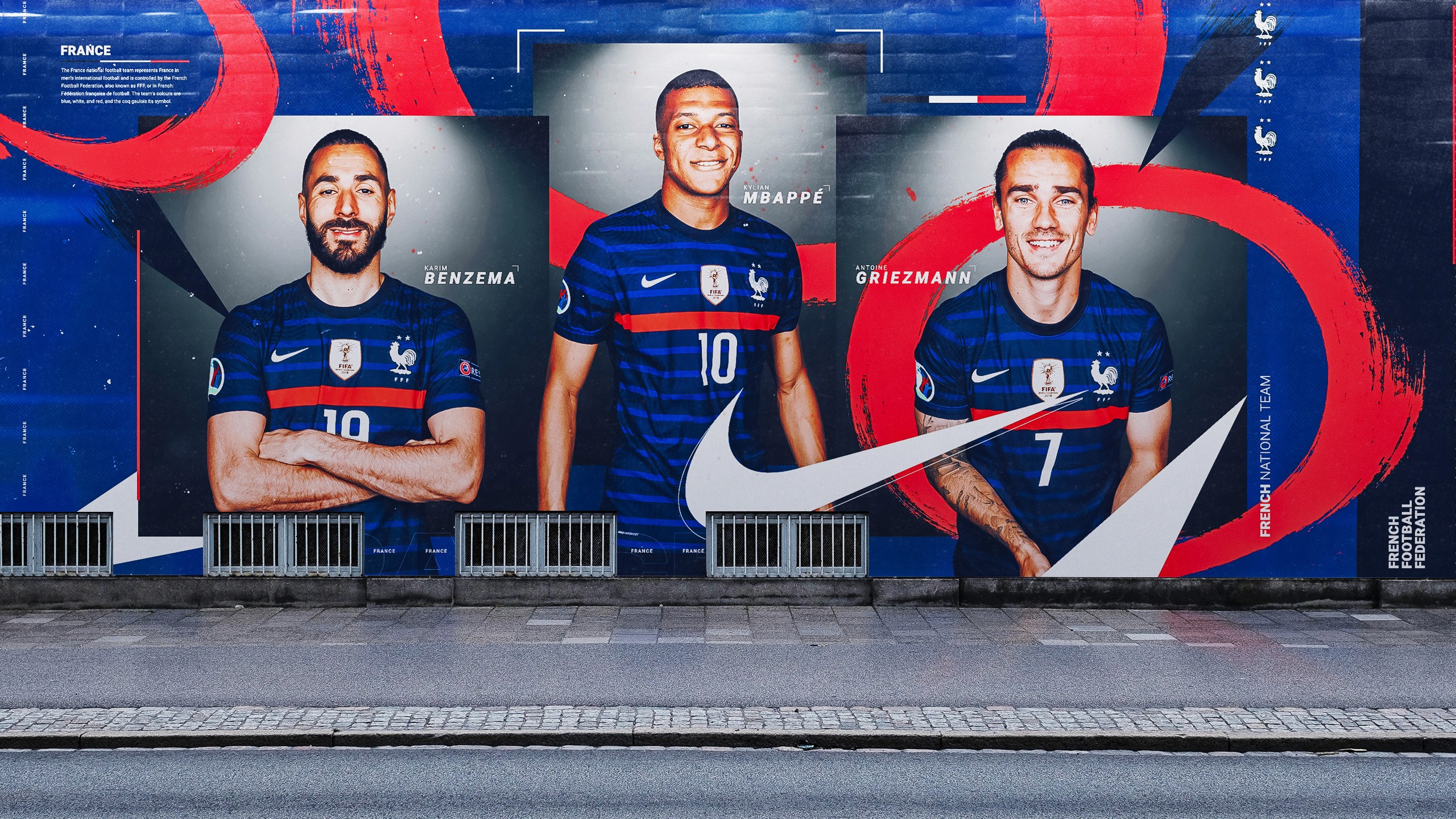 Iconic French landmarks, such as the Eiffel Tower, Arc de Triomphe, and Stade de France, were incorporated into the background to add depth and national pride to the composition. The Nike kit design worn by the players during the tournament was also featured as a key element, ensuring authenticity and continuity across the visual narrative.